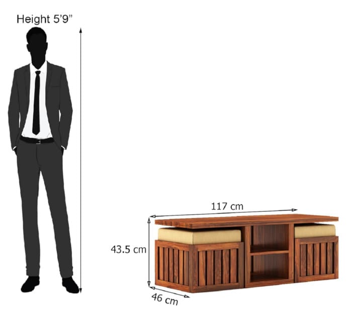 This center table is made from 100% solid Sheesham wood, known for its strength and long life. It comes with comfortable cushioned seating on both sides and open storage shelves in the center. This multipurpose product can be used as a center table as well as a seating bench. It includes a 10-year warranty against termites and insects.